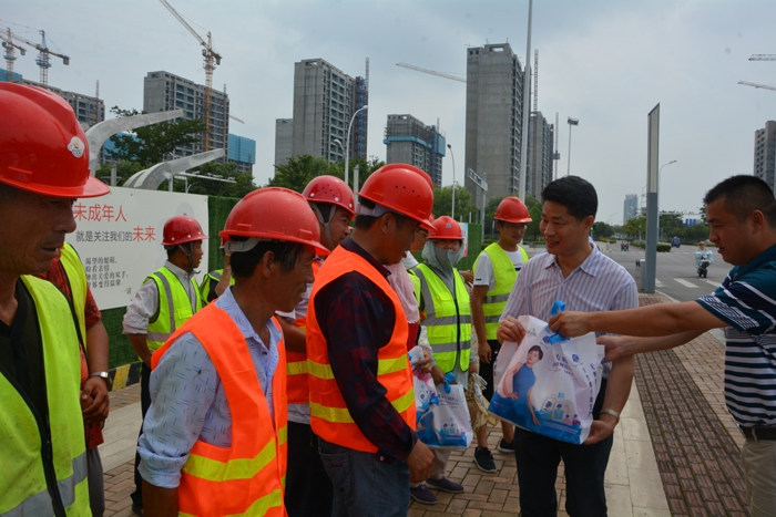 7月26日上午,開(kāi)發(fā)公司副總裁劉建華帶隊(duì)慰問(wèn)市政工程項(xiàng)目現(xiàn)場(chǎng)工人,給他們送去毛巾、香皂、洗發(fā)水等防暑降溫用品,感謝他們對(duì)園區(qū)市政工程的建設(shè)作出的貢獻(xiàn)。