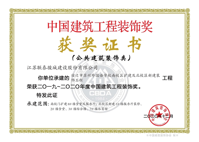 近期,傳來喜訊,由開發(fā)公司代建的宿遷市蘇州外國語學(xué)校南校區(qū)擴(kuò)建及北校區(qū)新建裝飾工程獲得中國建筑裝飾行業(yè)最高獎(jiǎng)項(xiàng)“中國建筑工程裝飾獎(jiǎng)”。