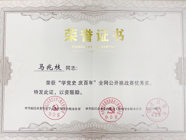 馬兆枝榮獲宿遷市“學(xué)黨史、慶百年”挑戰(zhàn)賽優(yōu)秀獎