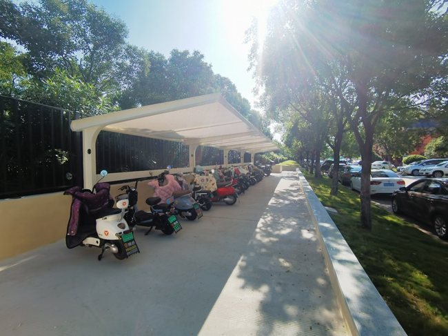 本次共建設(shè)17處膜結(jié)構(gòu)車(chē)棚,總約1100m2,共可停放380余輛非機(jī)動(dòng)車(chē),新車(chē)棚干凈明亮、設(shè)施齊全,既解決了停車(chē)需求,又消除了工業(yè)坊內(nèi)的電動(dòng)車(chē)安全隱患,得到了進(jìn)駐工友的一致好評(píng)。