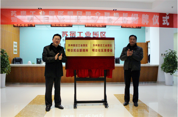 1月6日,宿遷市副市長,蘇宿園區(qū)黨工委書記、管委會主任方文浜與居民代表侍軍共同為明日民眾聯絡所和明日社區(qū)居委會揭牌,園區(qū)第二個民眾聯絡所正式建成投用,第一個社區(qū)居委會正式成立。